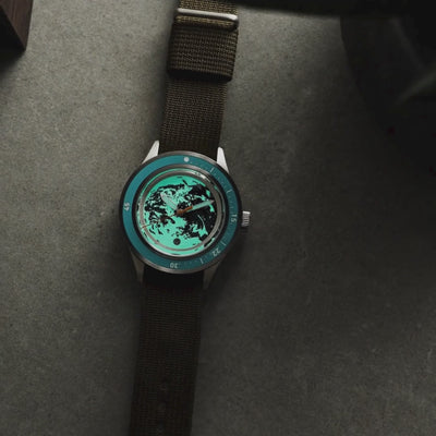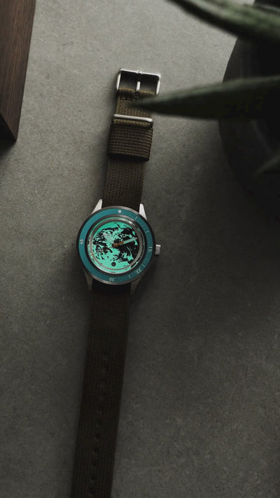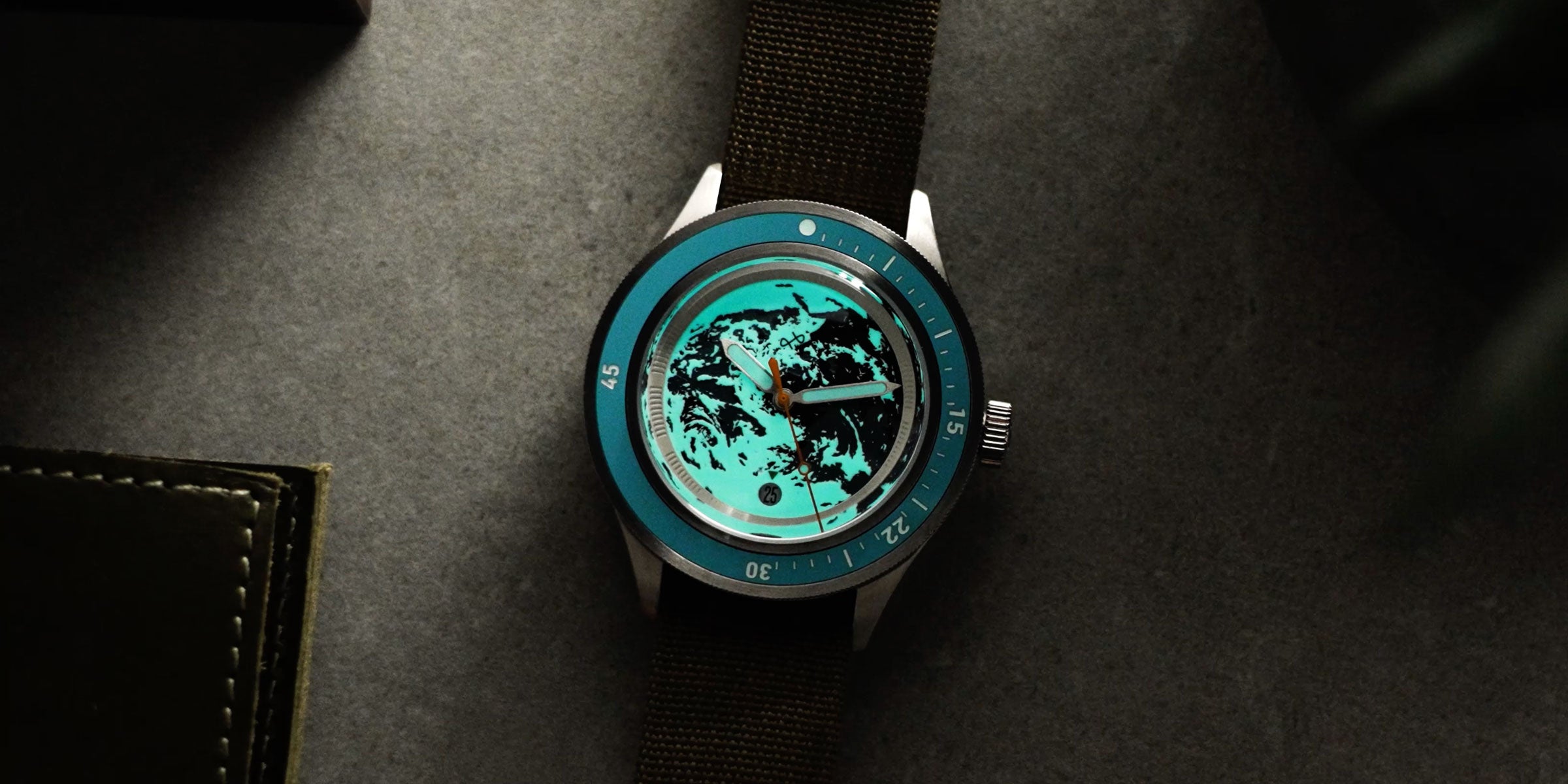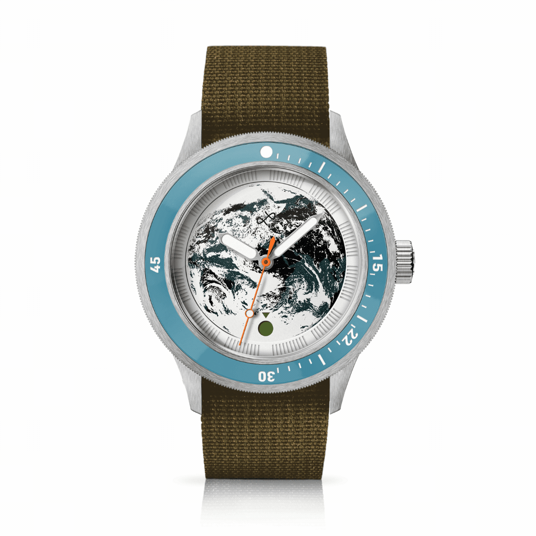 Inspiriert von der legendären Aufnahme unseres Planeten aus dem Weltraum erinnert diese Uhr täglich an die Schönheit, die Zerbrechlichkeit und die Verbundenheit der Natur. Das vollständig mit Leuchtmasse befüllte Zifferblatt fängt das Leuchten der Erde vor dem Hintergrund der Dunkelheit des Weltraums ein, während das Datumsfenster einen grünen Punkt aufweist, der den 22. jedes Monats markiert – ein kleiner, aber wirkungsvoller Anstoß, achtsam mit unserem Planeten umzugehen.