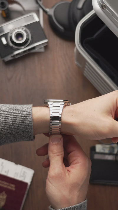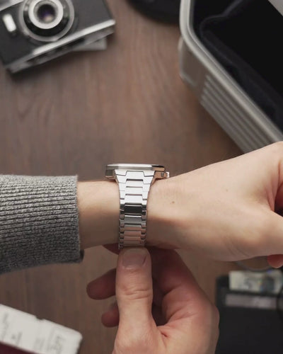 We designed both bracelet and strap as integrated parts of the watch - interchangeable with quick release. The steel links taper with precision, while the rubber strap brings flexibility and strength for daily wear. Both follow the shape of the case in one continuous line, created to sit light and naturally on the wrist.
