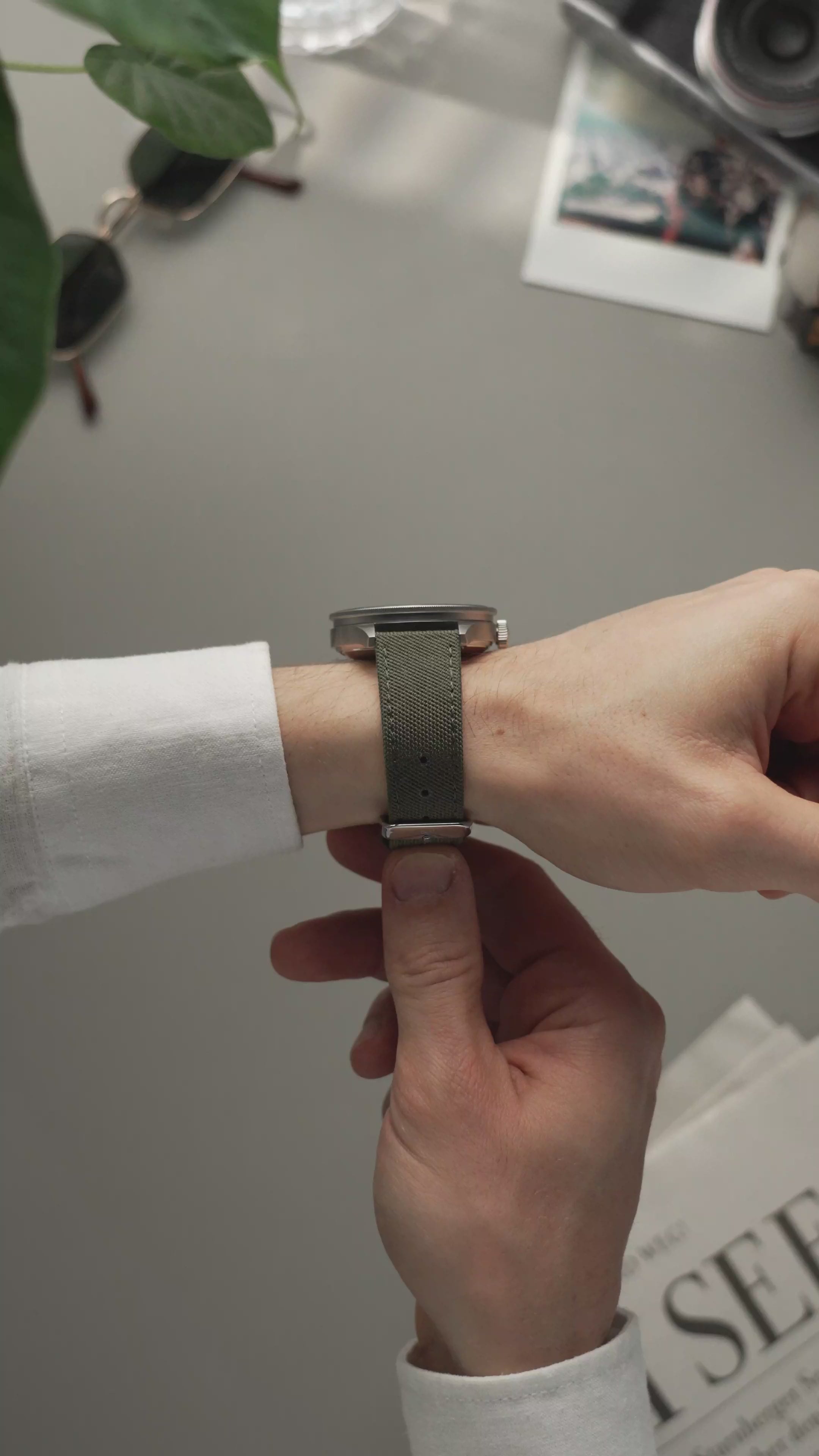 THE DIAL FEATURES A RIDGED TEXTURE THAT ADDS SUBTLE DEPTH AND DIMENSION, PLAYING GENTLY WITH LIGHT THROUGHOUT THE DAY. WITH BOLD LUMINOUS MARKERS, THE LAYOUT IS BALANCED AND BRINGS CLARITY AND CHARACTER TO THE WRIST — FINISHED IN A COLOR PALETTE INSPIRED BY LIGHT AND MOVEMENT.