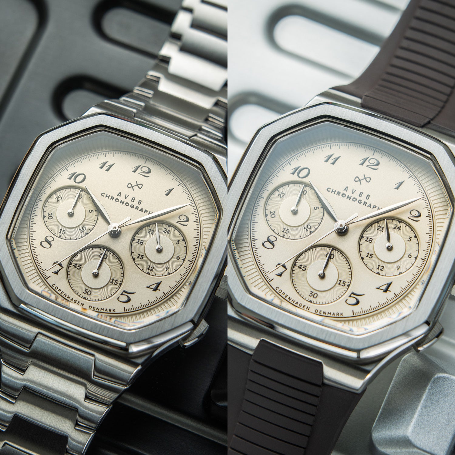 We designed both bracelet and strap as integrated parts of the watch - interchangeable with quick release. The steel links taper with precision, while the rubber strap brings flexibility and strength for daily wear. Both follow the shape of the case in one continuous line, created to sit light and naturally on the wrist.