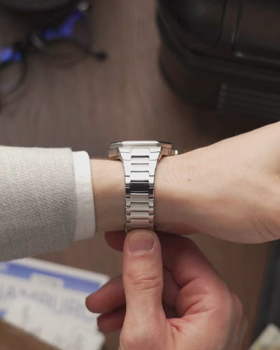 The bracelet and strap extend directly from the case, shaped to create a seamless fit with balance and comfort in every detail.