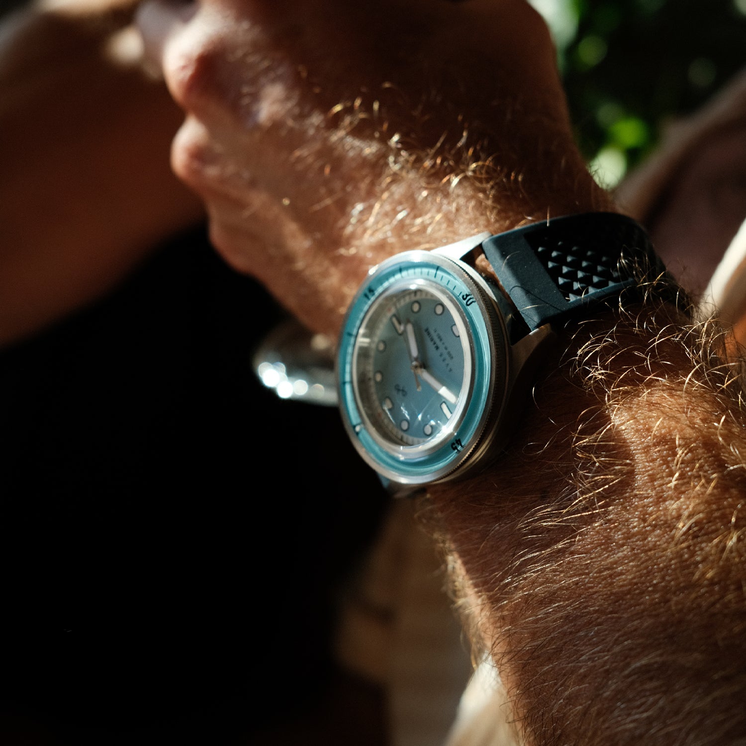 ダイヤルには繊細な奥行きを生むリッジ状のテクスチャーが施され、日中の光を柔らかく受けて表情を変えます。力強いルミナスマーカーと、均整の取れたバランスと明瞭さをもたらし、手元に個性を添えます。カラーは光と動きから着想を得たパレットで仕上げられています。