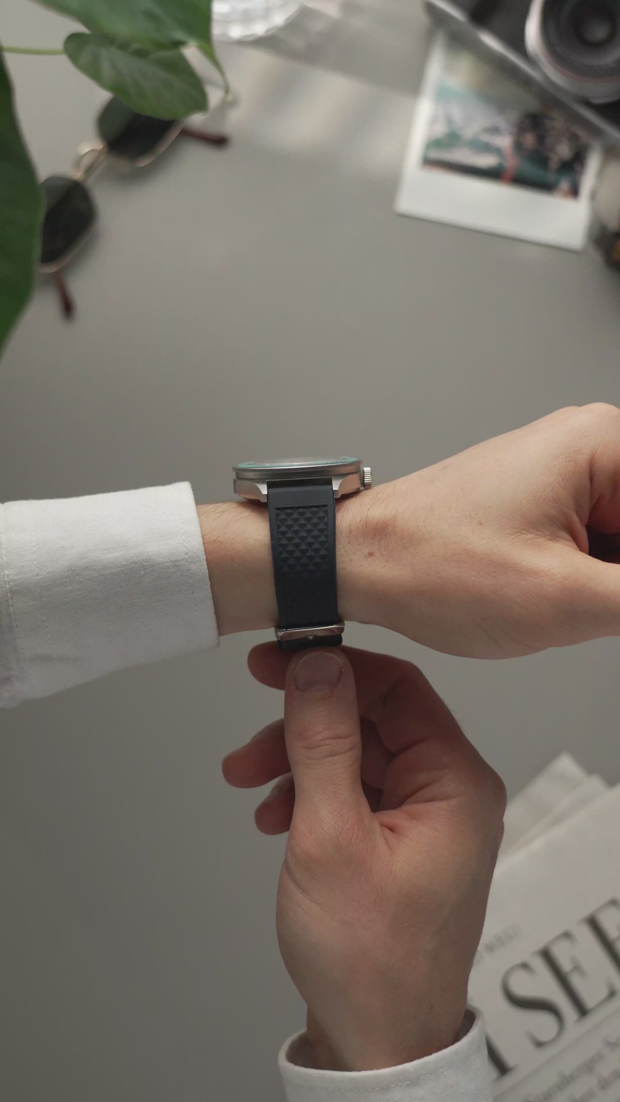 私たちの全ての時計には、クィックリリースのシステムが付いています。それはつまり、時計のベルトをブレスレットに変えたりして、全く違うルックスに簡単にイメージチェンジができるということです。例えば、スポーツイベントのお供にはシリコンストラップをつけてみたり、お洒落をしてお出かけをするときにはメタルブレスにイメージチェンジをしてみてはいかがでしょうか。