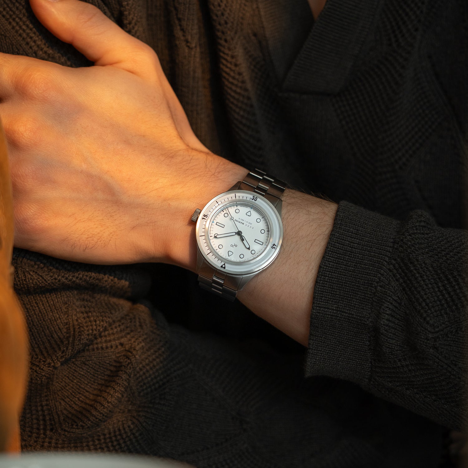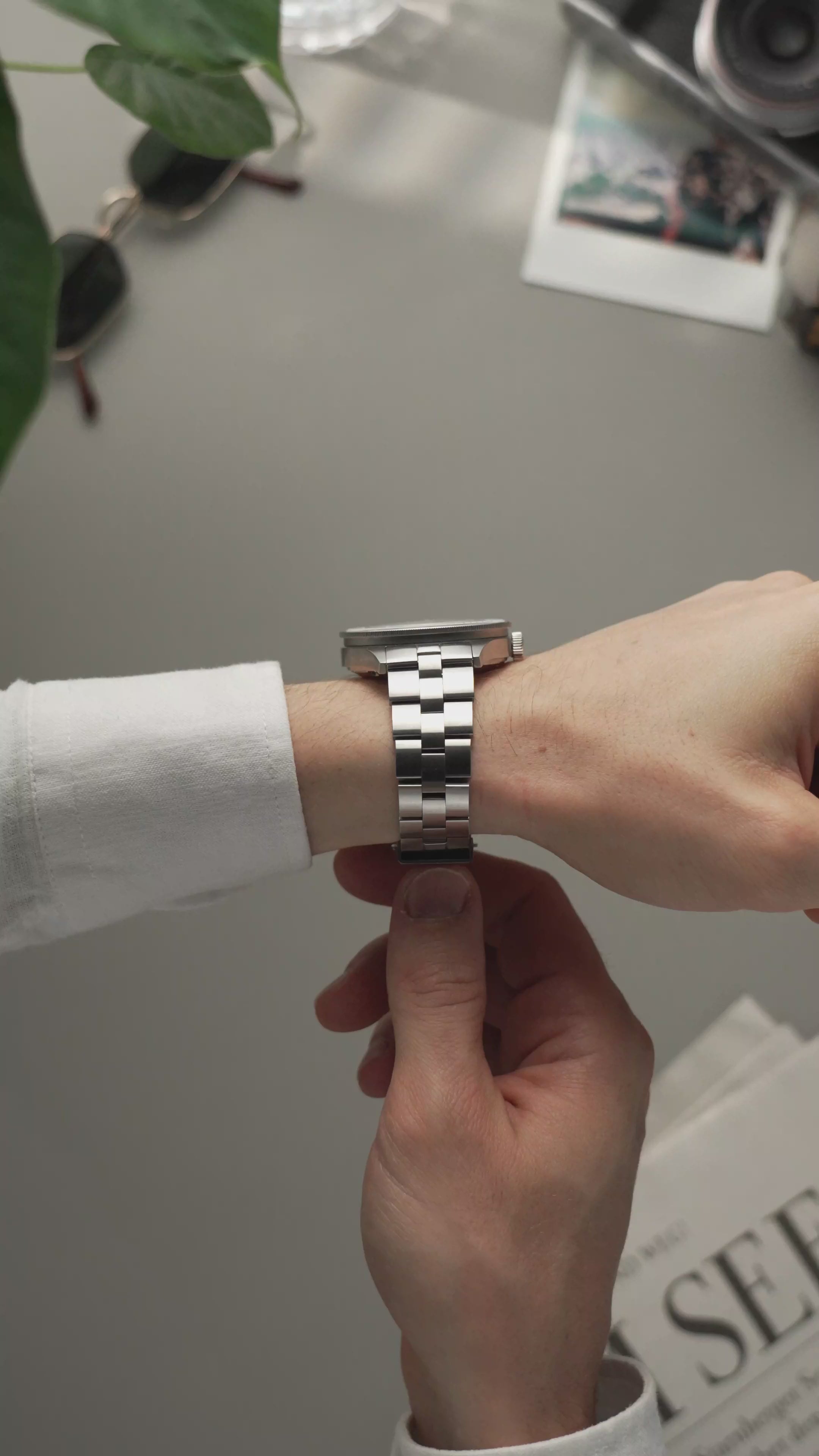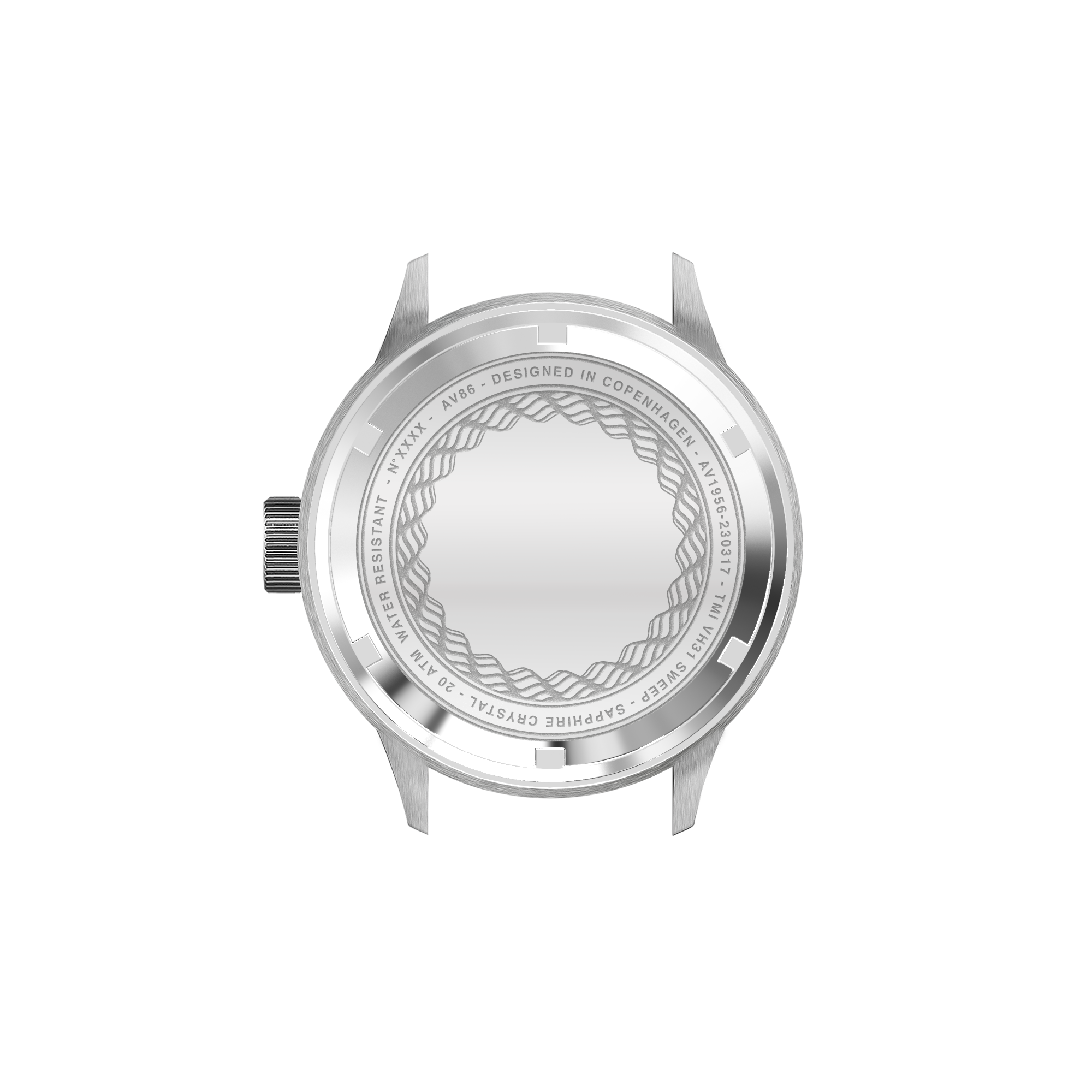 ステンレススチール製のケースは、タフさとシンプルさの絶妙なバランスを追求しています。磨き上げられた面と滑らかなラグ、そしてタイムレスでありながら表情豊かなフォルムが特徴で、日常使いにふさわしい快適さと高い耐久性を兼ね備えています。