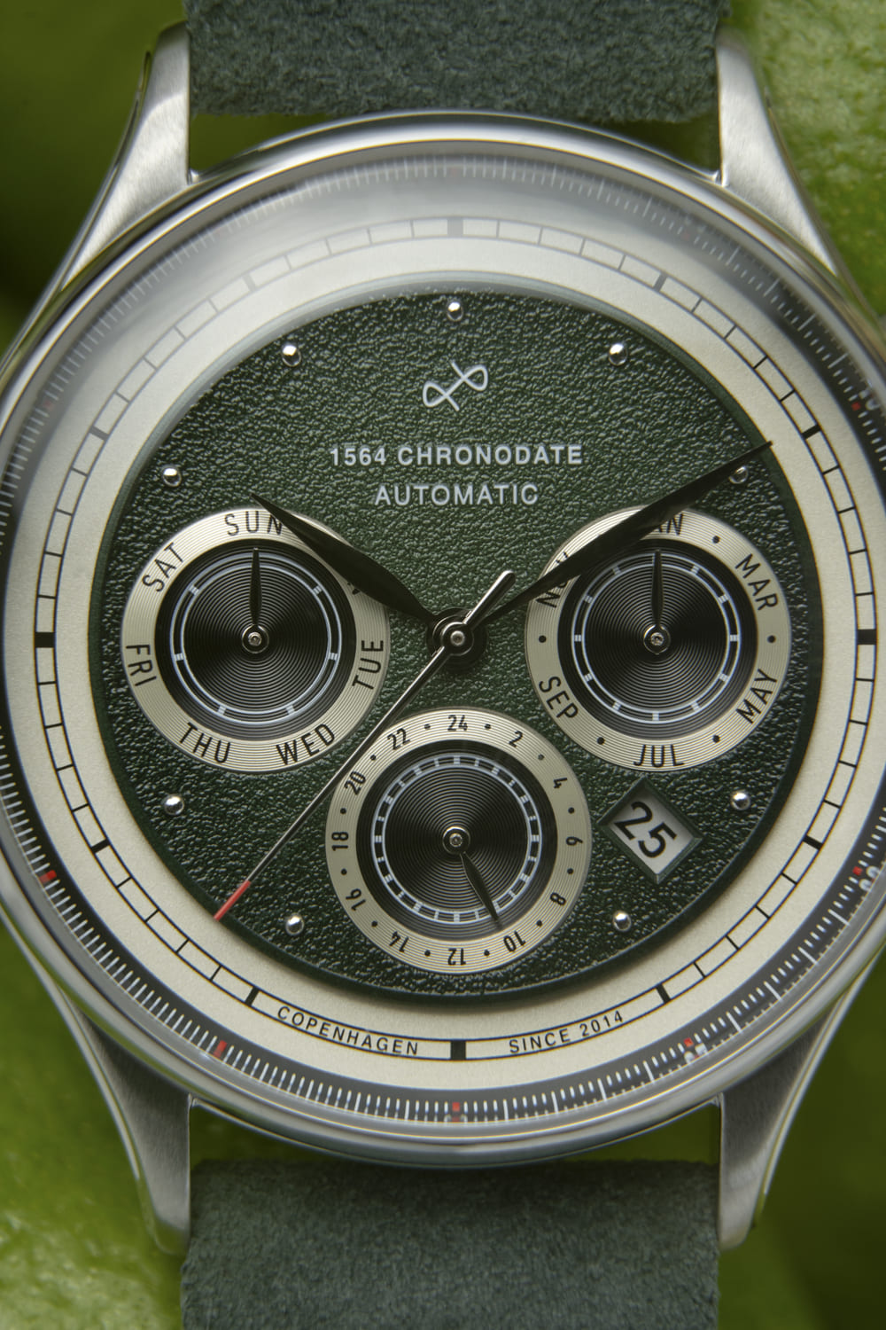 1564 Automatic Chronodate celebrates our first decade as a watch brand. The design balances vintage and contemporary elements, honoring our history while also looking forward. The case combines polished and brushed finishes to accentuate its curves and layered structure.